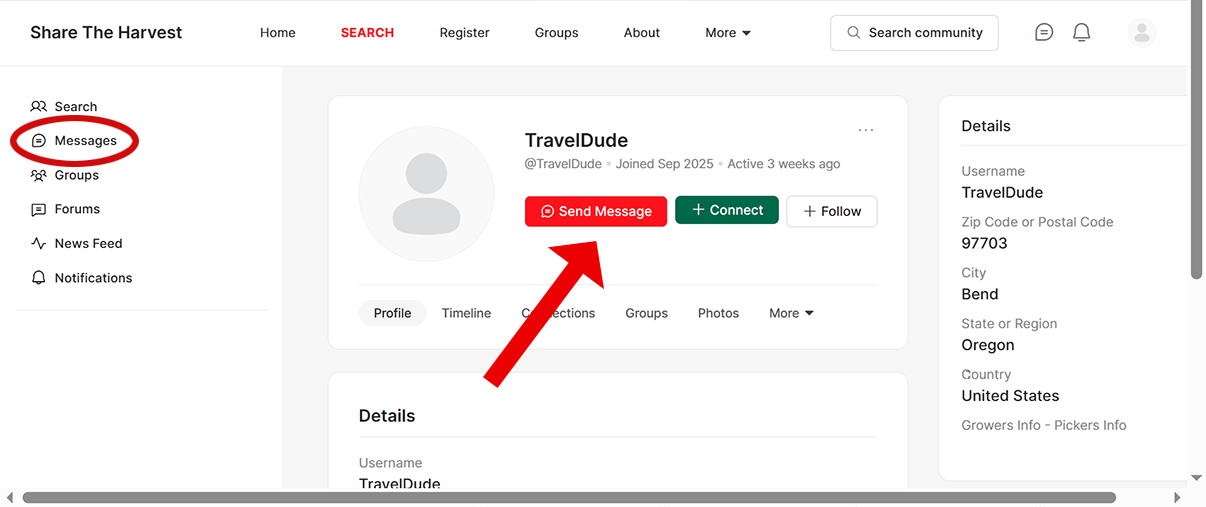 Click the Send Message button in their profile window to message them to see about setting up a time to pick. (You can also click the Messages link in the left column to check your messages.)