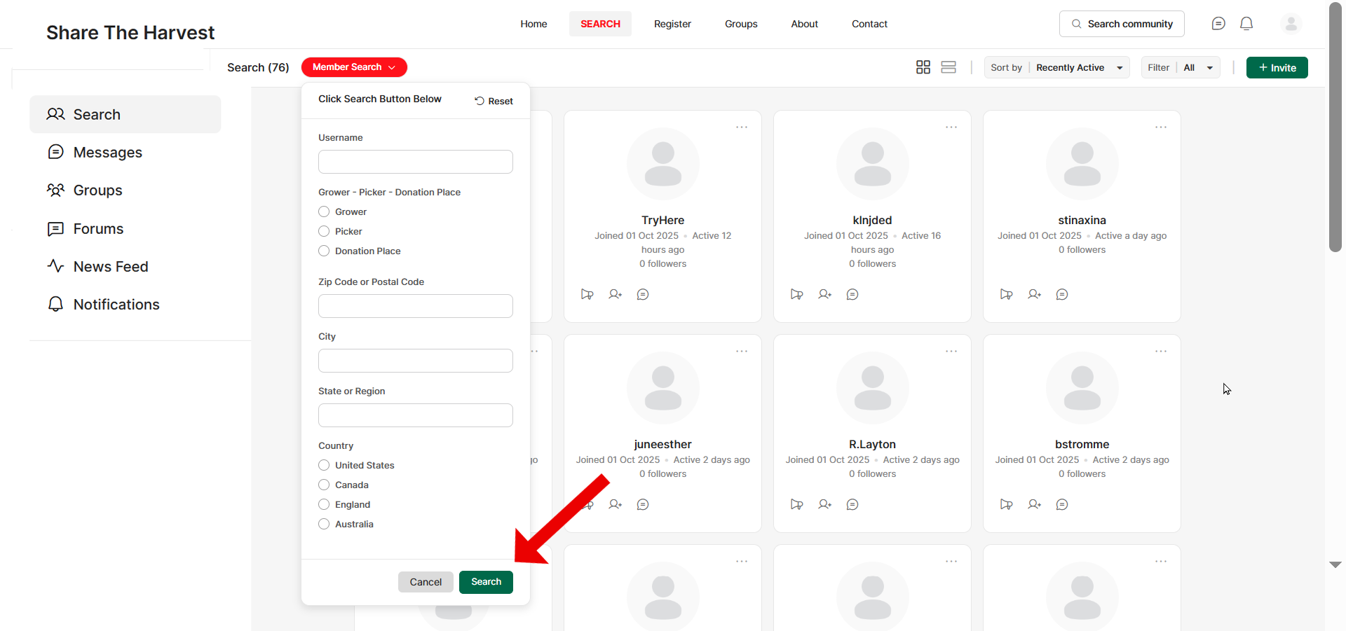 1. Click on SEARCH in the top menu to go to the Search Page and then click the Member Search button at the top left of your Search page to get the drop down search box.